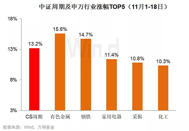 进入11月以来,顺周期板块走强。Wind数据显示,11月1-18日,中证周期指数上涨13.2%,同期上证指数上涨3.8%,创业板下跌1.3%。
