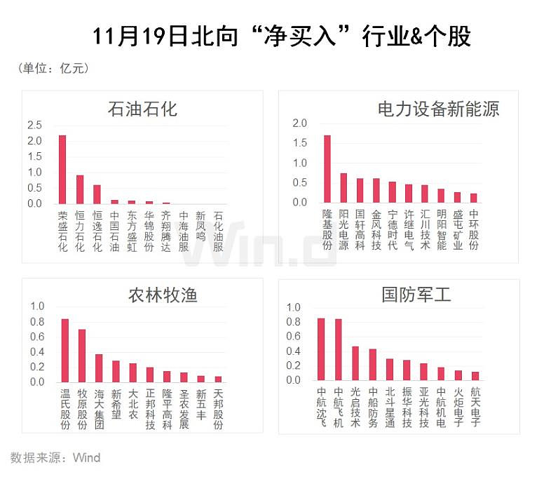 Wind通过统计分析发现,从行业角度来观察,11月19日,北向资金净买入金额排名靠前的行业有:石油石化、电力设备新能源、农林牧渔、国防军工、家电;净卖出行业靠前的有:电子、电力及公用事业、房地产、通信、食品饮料。