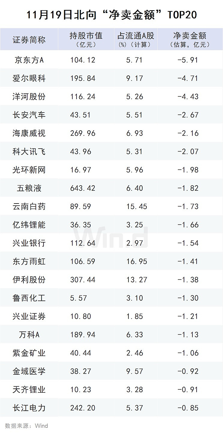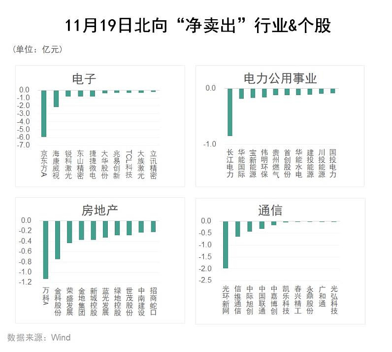 11月19日,北向重点减仓电子,金额达到了9.5亿元;通信行业是近期连续减持的板块。