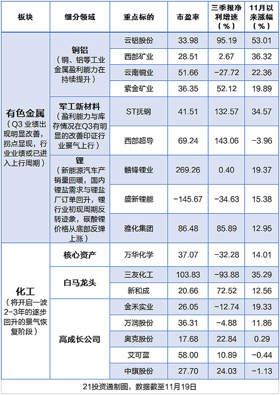 山证国际证券亦表示,主要经济体的补库存需求和通胀预期将改善企业的盈利预期,资金将逐步开始布局周期股,刺激部分顺周期性股票录得较好的市场表现,建议积极关注有色金属、化工等顺周期板块的龙头企业。