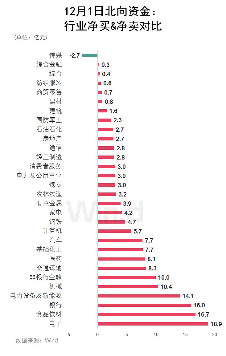Wind通过统计分析发现,从行业角度来观察,12月1日,北向资金呈现全行业加仓的态势,净买入金额靠前的行业:电子、食品饮料、银行、电力设备新能源、机械,这几个行业的净买入金额均超过10亿元。