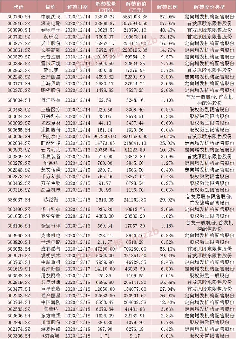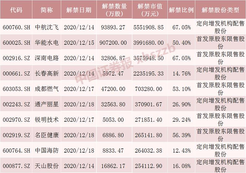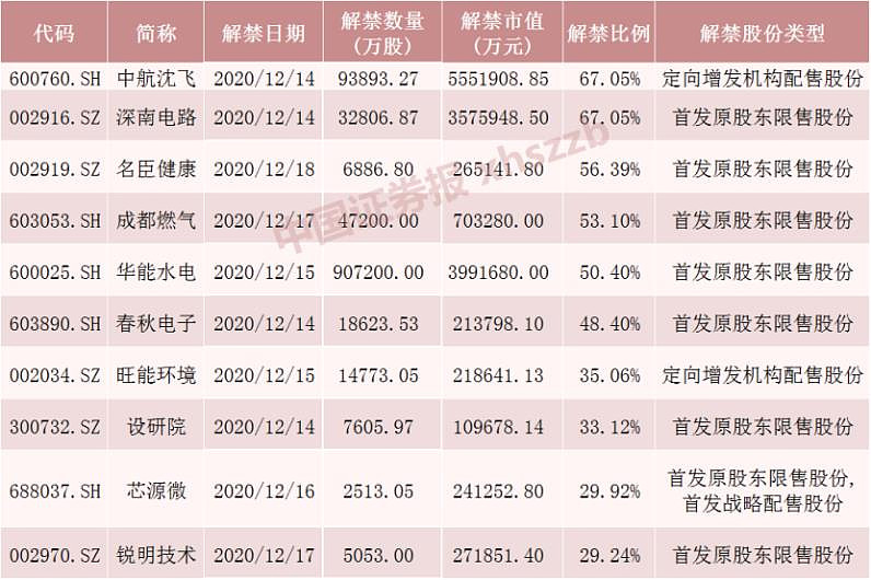 具体来看,Wind数据显示,中航沈飞12月14日将解禁9.39亿股,均为定向增发机构配售股份。华能水电12月15日将解禁90.72亿股,均为首发原股东限售股份。深南电路12月14日将解禁3.28亿股,均为首发原股东限售股份。长春高新12月14日将解禁5972.47万股,均为定向增发机构配售股份。