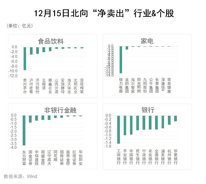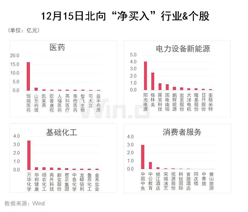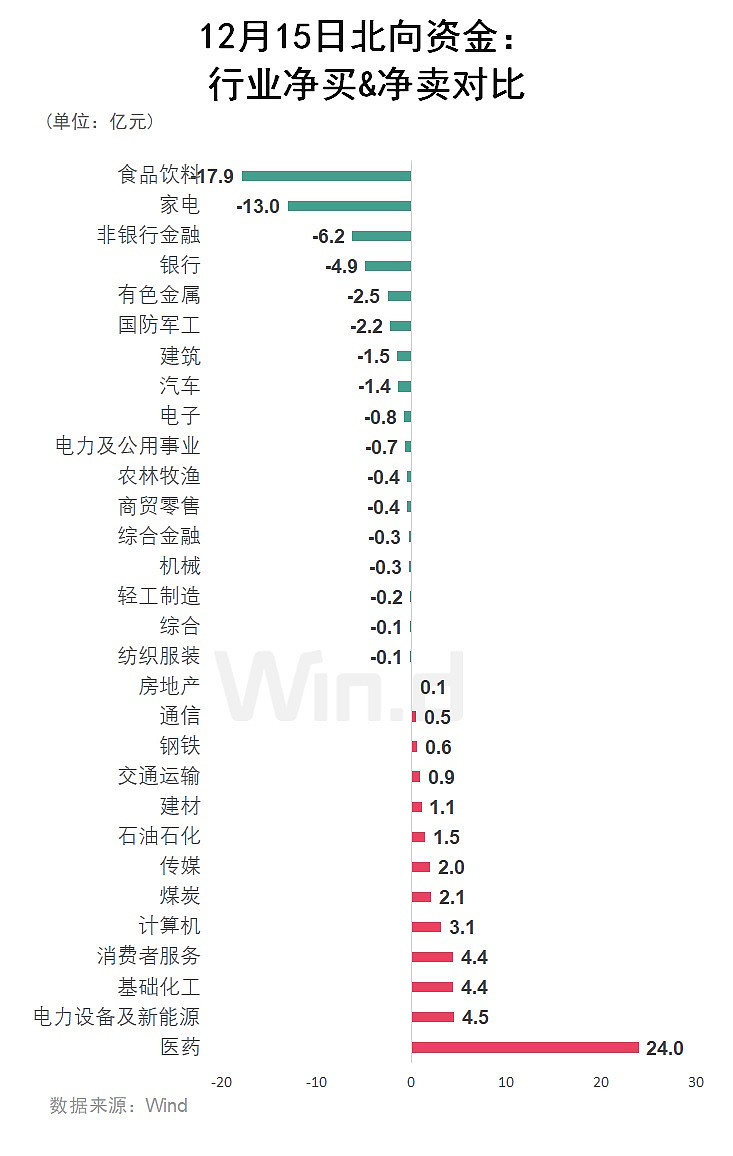 Wind通过统计分析发现,从行业角度来观察,12月15日,北向资金净买入金额靠前的行业:医药、电力设备新能源、基础化工、消费者服务、计算机;净卖出靠前的行业:食品饮料、家电、非银行金融、银行、有色金属。