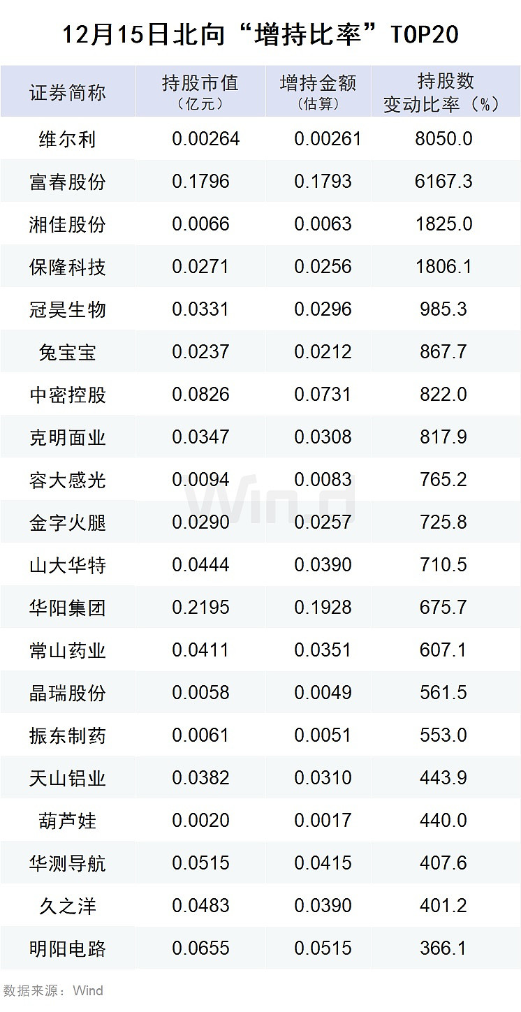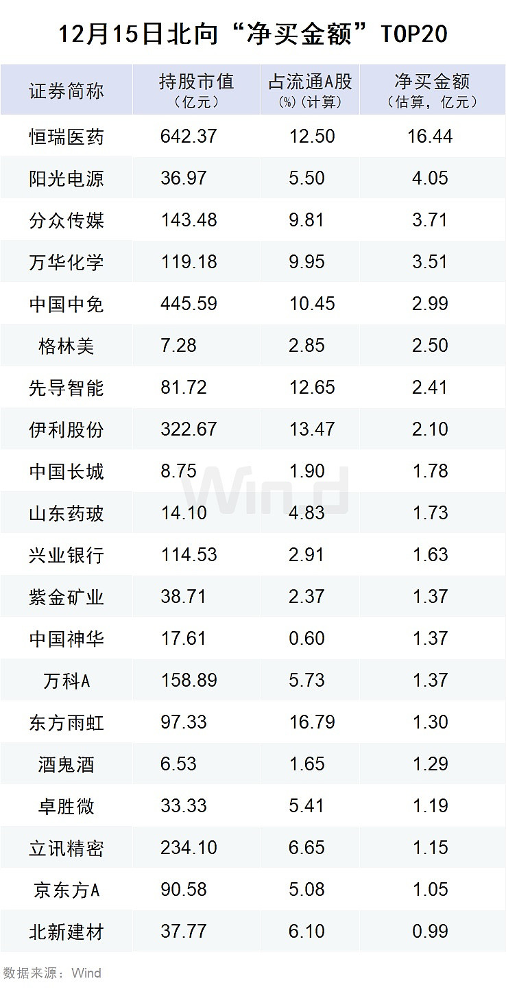 北向资金汹涌买入恒瑞医药16.44亿元,该股当日放量大涨7.67%,但行业和个股方面均未有明显异常信息。即便在北向资金全天净买超百亿的时候,对某只个股的净买入也不过10亿元左右,12月15日北向资金对恒瑞医药的暴击显得格外扎眼,有传言称,恒瑞医药抗癌新药近期即将获批上市,果真如此,那可能涉及内幕交易嫌疑了。