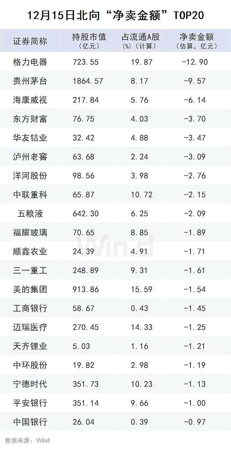 净卖出方面,格力电器因从MSCI标准指数和大型股系列剔除,被大额甩卖。香港交易所公告称,因格力电器总境外持股比例超过28%,12月14日起,深港通暂停接受该股的买盘,卖盘仍会被接受。基于此,格力电器后续可能还会被北向资金大额净减持。