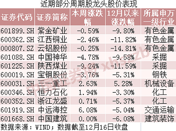 从前期领涨的部分龙头周期股12月以来的股价表现来看,不少龙头股均出现了较为深度的阶段性调整。