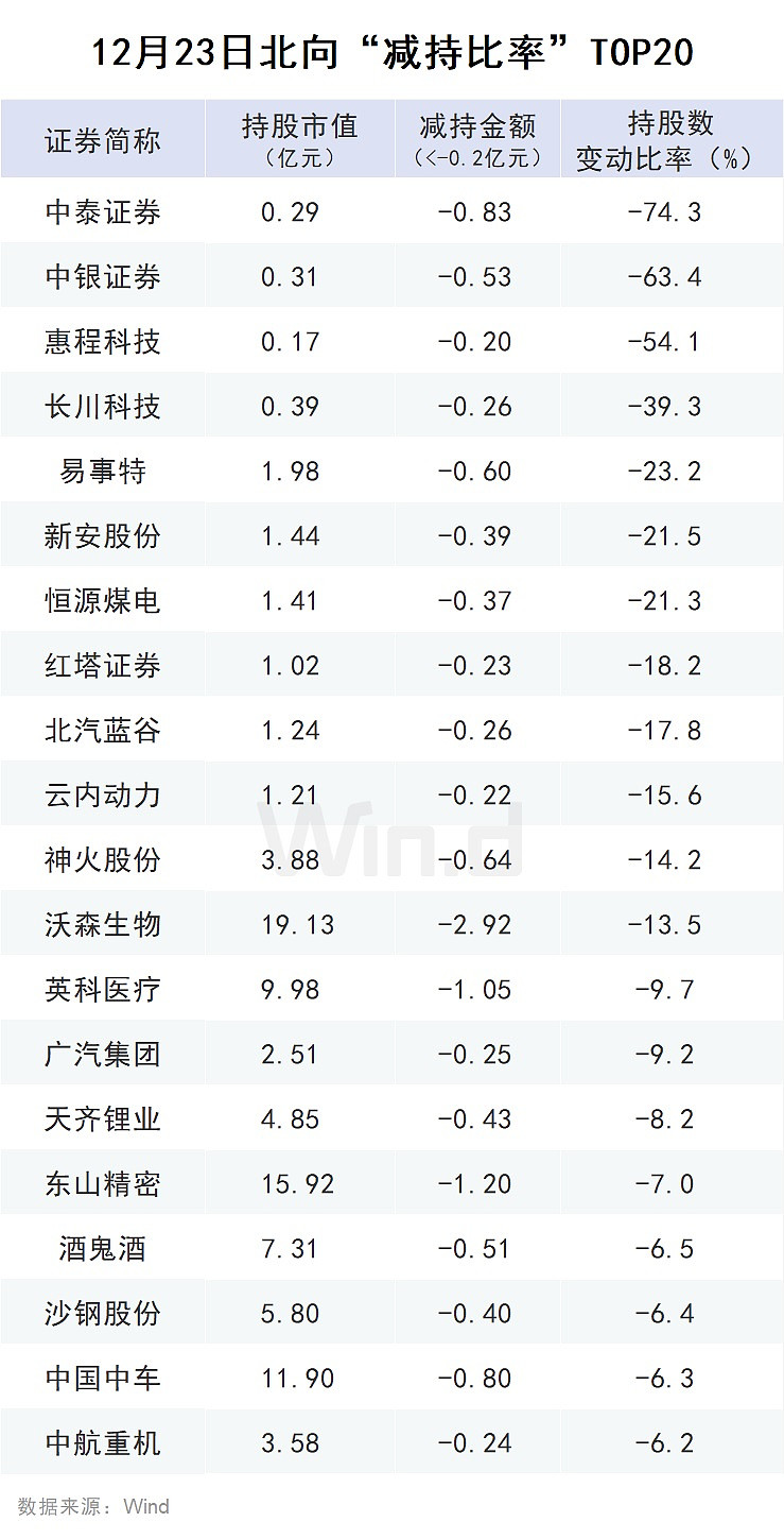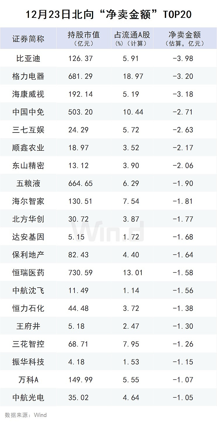 Wind通过统计分析发现,从行业角度来观察,12月23日,北向资金净买入金额靠前的行业:电力设备及新能源、电子、非银行金融、机械、基础化工;净卖出金额靠前的行业有国防军工、家电、传媒、消费者服务、房地产、商贸零售。