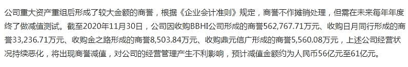 公司重大资产重组后形成了较大金额的商誉,根据《企业会计准则》规定,商誉不作摊销处理,但需在未来每年年度终了做减值测试。截至2020年11月30日,公司因收购BBHI公司形成的商誉562,767.71万元、收购日月同行形成的商誉33,236.71万元、收购金之路形成的商誉8,503.84万元、收购鼎元信广形成的商誉5,560.08万元,上述公司经营状况持续恶化,将出现商誉减值,对公司的经营管理产生不利影响,预计减值金额约为人民币56亿元至61亿元。