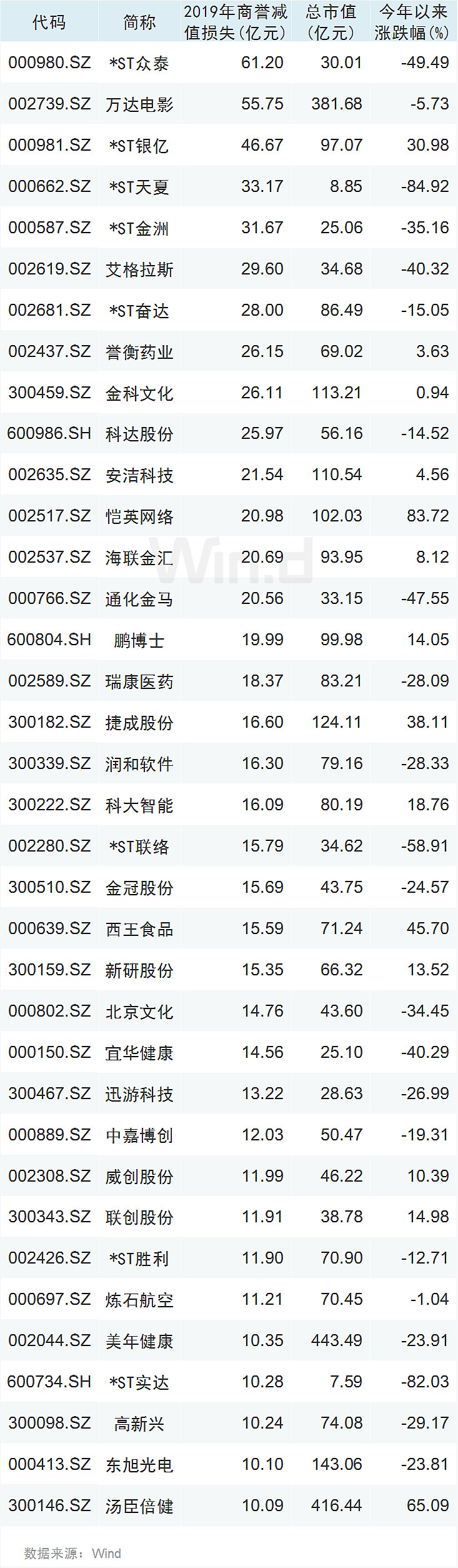 最近两年大额商誉爆雷尤为频发,2018年有44家公司商誉减值损失超过10亿元,2019年仍有37家公司商誉减值超过10亿元,从相关公司今年以来表现看,虽然市场整体大幅上涨,但多数爆雷股股价出现大幅下跌。其中,*ST众泰、*ST天夏、*ST金洲、艾格拉斯、通化金马、瑞康医药、润和软件等公司今年以来跌幅超过20%。
