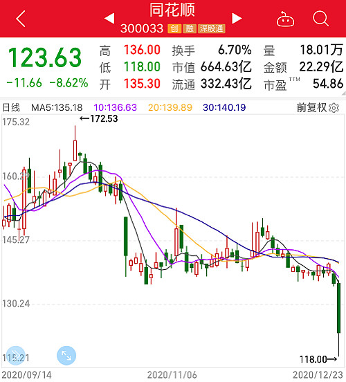 12月23日,炒股软件龙头同花顺股价大跌,盘中最大跌幅达12.78%,报118元,股价创今年6月以来新低。截至最新收盘,同花顺股价为123.63元,跌8.62%,成交额为22.29亿元,换手率为6.7%,总市值为664.63亿元,较上一交易日市值蒸发超60亿元。