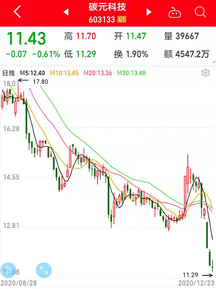 12月18日晚间,碳元科技发公告称,公司控股股东、实际控制人徐世中因个人资金需求,计划通过集中竞价交易或大宗交易或协议转让的方式减持合计不超过1700万股,即合计减持比例不超过公司总股本的8.08%。12月21日以来,碳元科技连续大跌,最新收盘价为11.43元,累计跌幅为14.96%