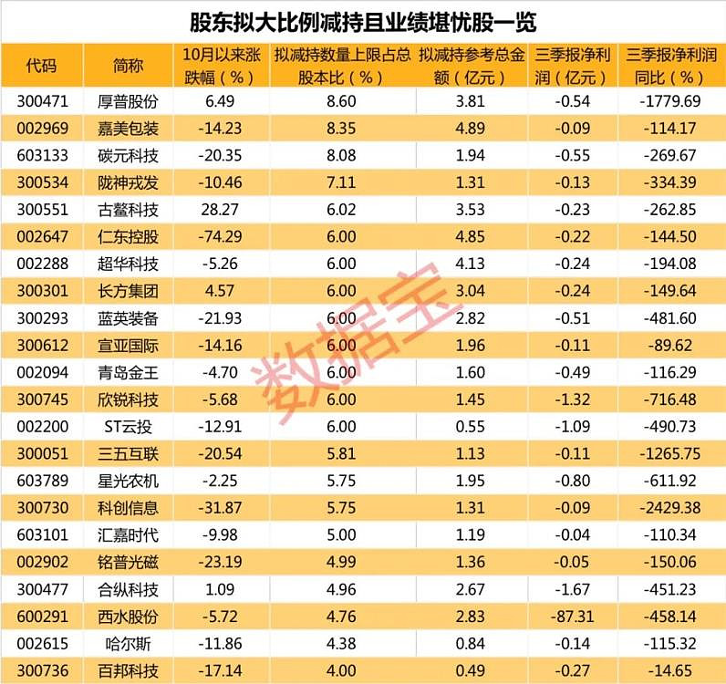 此外,减持计划的发布与业绩不佳也有一定关系,统计显示,上述641家减持股中,10月以来股东拟减持比例合计超过1%,且前三季业绩亏损的同时,业绩同比呈下滑趋势的有66家,其中厚普股份、嘉美包装、碳元科技、陇神戎发、古鳌科技、仁东控股、超华科技、长方集团、蓝英装备、宣亚国际、青岛金王、欣锐科技和ST云投的股东合计减持比例均超过6%。这些减持比例合计超过1%的股中,绝大多数股前三季度业绩出现翻倍下滑。