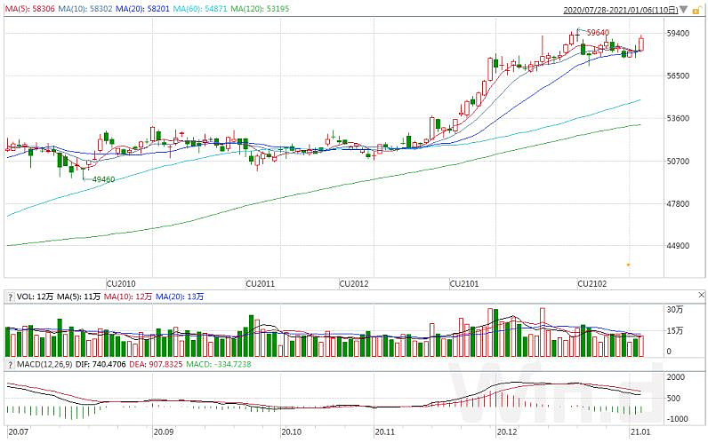 1月6日,沪铜主力合约盘中一度涨超1000元,站上59000元/吨。截止收盘报59030,涨幅1.62%。
