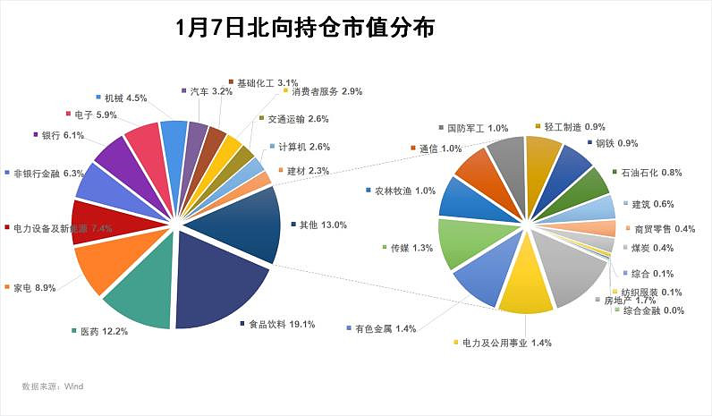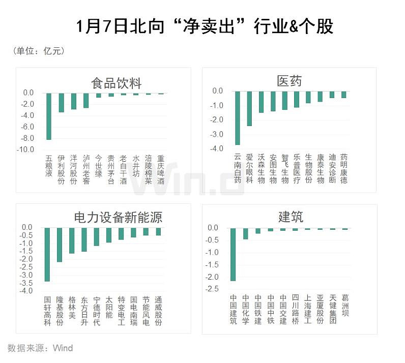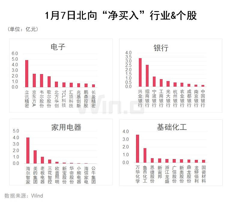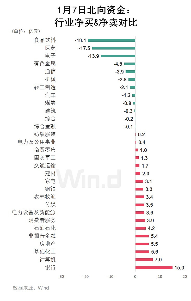 Wind通过统计分析发现,从行业角度来观察,1月7日,北向资金净买入金额靠前的行业:电子、银行、家电、基础化工、石油石化;净卖出金额靠前的行业有食品饮料、医药、电力设备新能源、建筑、消费者服务。