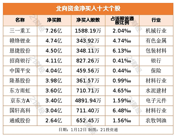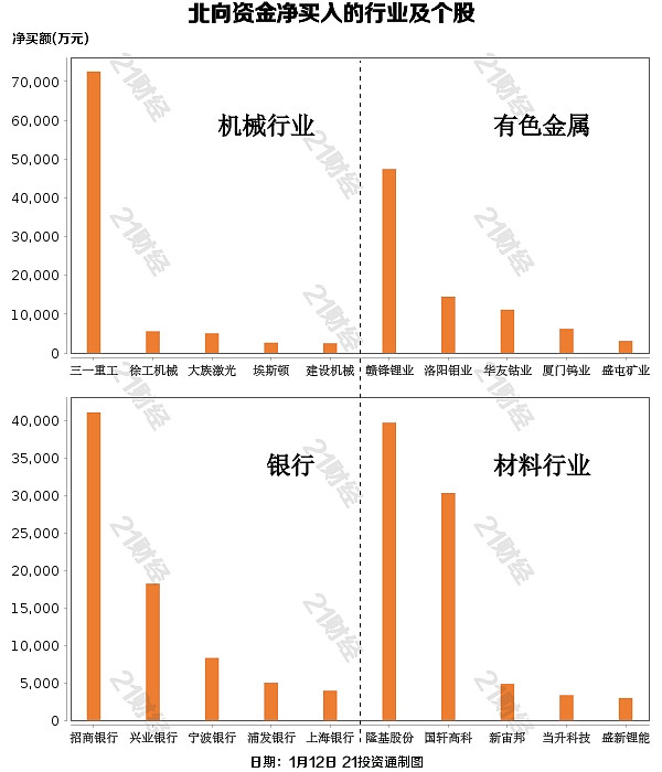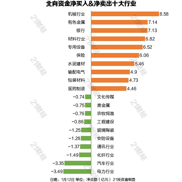 从净买入金额来看,1月12日,北向资金增持了41个行业,其中机械行业居首,净买入金额达8.58亿元,其次是有色金属行业,净买入7.14亿元。