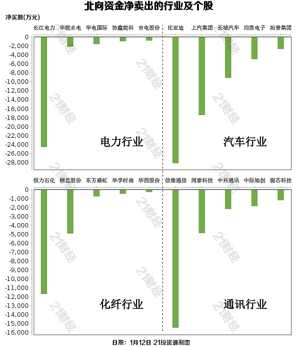 北向资金减持了19个行业,其中电力行业最多,净卖出金额达3.49亿元,其次是汽车行业,净卖出3.35亿元。