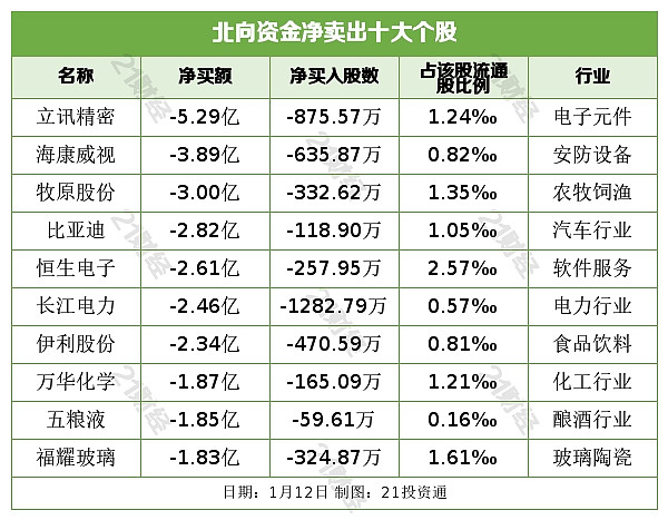 北向资金净卖出立讯精密(002475.SZ)、海康威视(002415.SZ)、牧原股份(002714.SZ)、比亚迪(002594.SZ)、恒生电子(600570.SH)居前,其中,立讯精密被净卖出5.29亿元,海康威视被净卖出3.89亿元,牧原股份被净卖出3.00亿元,比亚迪被净卖出2.82亿元,恒生电子被净卖出2.61亿元。