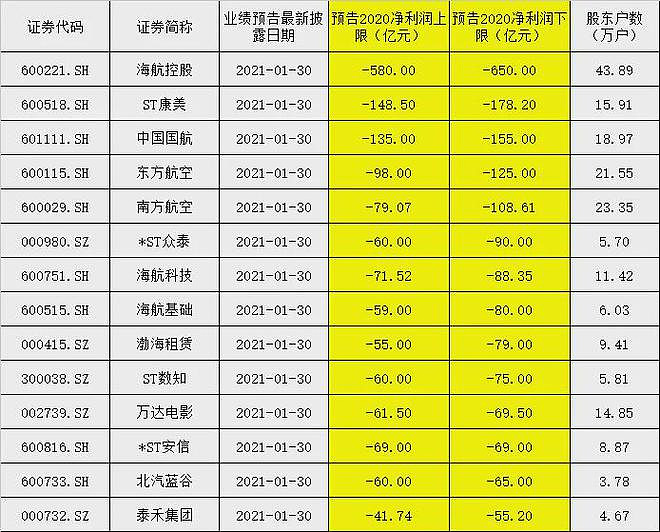 据中国基金报统计,1月30日预告亏损下限超过50亿的股票有14只,合计预亏1578亿-1888亿。这14只股票涉及最新股东户数达194.21万户。