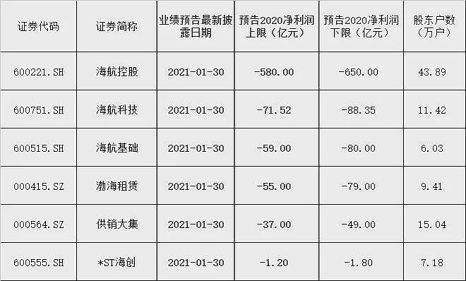 同时,海航科技、海航基础、渤海租赁也都出现50亿元以上的亏损,供销大集也出现较大亏损,*ST海创也亏损。