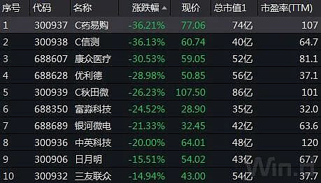 此外,C信测跌超36%,康众医疗跌约30%,优利德、C秋田微跌幅超25%,富淼科技、银河微电跌幅超20%。