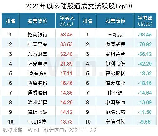 从沪股通、深股通前十大活跃股情况看,2021年以来沪深两市每日活跃股中,共有26只个股出现北上资金净买入,21只个股被净卖出。其中招商银行净流入额超过50亿元,位居首位。五粮液遭净卖出93.45亿元。