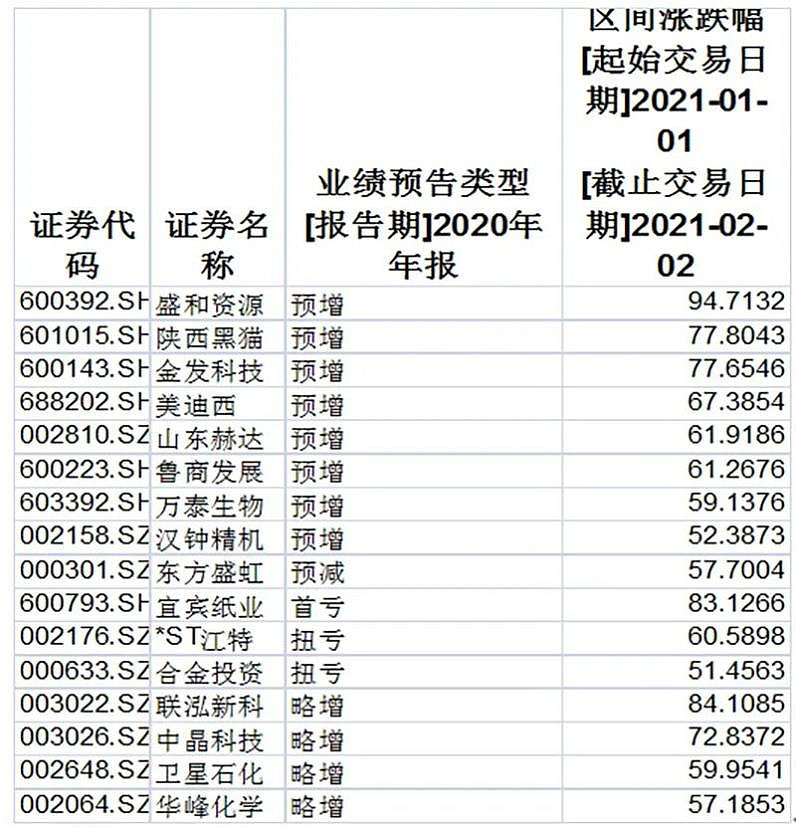 数据显示,今年以来(截至2月2日),剔除次新股,有23家公司涨幅超过50%,其中16家披露了业绩预告,其中近九成公司预增、略增或者扭亏。