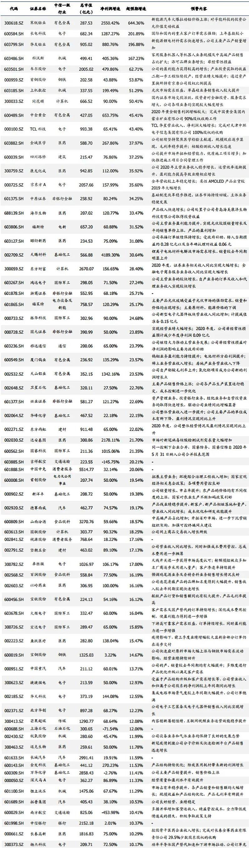 国盛证券将实际披露情况与截至 2020年底市场的一致预期进行对比,增速高出10%定义为超预期,显示共有224个股票业绩超预期。进一步筛选市值大于200亿元,同时业绩提升主要由主营贡献的超预期个股,共68个,其中电子、医药、有色金属和基础化工等行业分布较多。