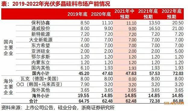据中国有色金属工业协会硅业分会有关专家预计,2021年硅料国内新增产能10万吨(新增产能主要在下半年),国内供应量预计在47~48 万吨,加上进口的10万吨,共计57~58 万吨的总供应量,预计可以支撑200GW硅片。具体如下表所示。