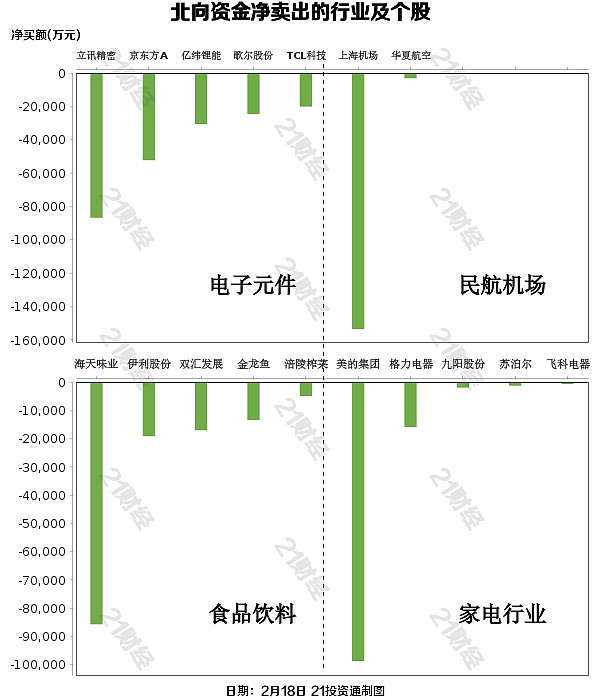北向资金减持了20个行业,其中电子元件最多,净卖出金额达22.96亿元,其次是民航机场行业,净卖出13.88亿元。