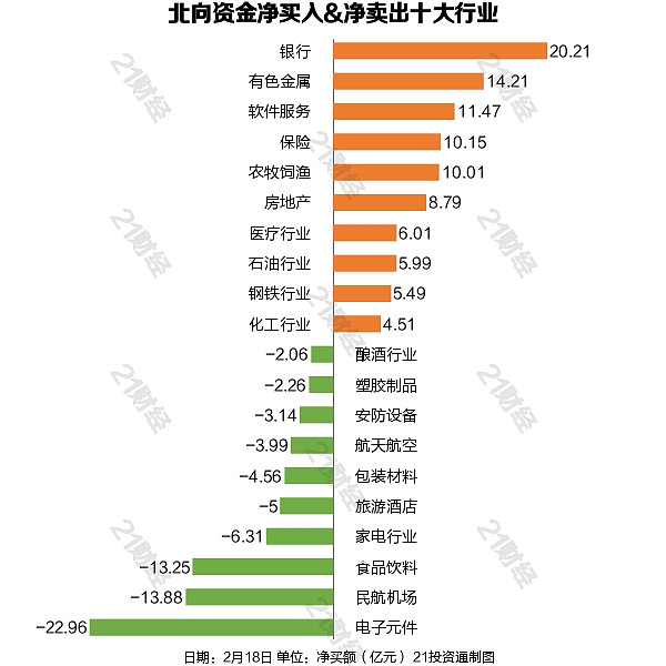 从净买入金额来看,北向资金增持了40个行业,其中银行居首,净买入金额达20.21亿元,其次是有色金属行业,净买入14.21亿元。