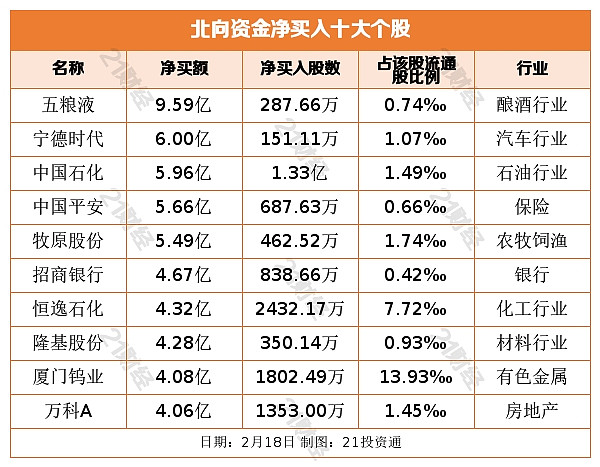据21投资通智能监测,2月18日,北向资金净买入50.73亿元,其中沪股通净买入26.72亿元,深股通净买入24.02亿元。