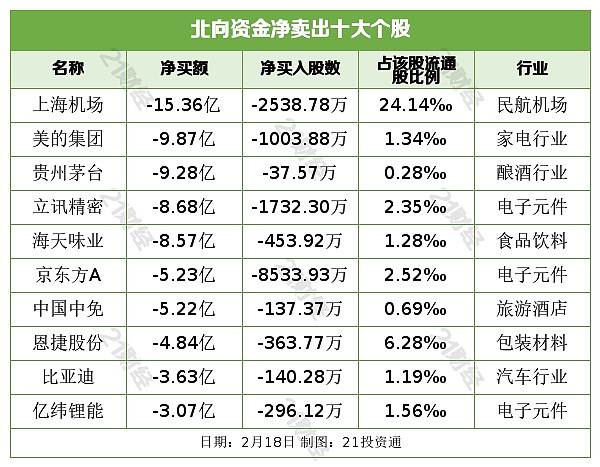 北向资金净卖出上海机场(600009.SH)、美的集团(000333.SZ)、贵州茅台(600519.SH)、立讯精密(002475.SZ)、海天味业(603288.SH)居前,其中,上海机场被净卖出15.36亿元,美的集团被净卖出9.87亿元,贵州茅台被净卖出9.28亿元,立讯精密被净卖出8.68亿元,海天味业被净卖出8.57亿元。