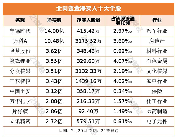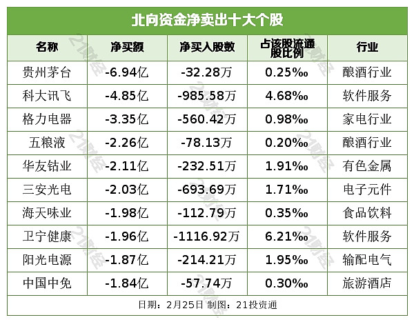 据21投资通智能监测,2月25日,北向资金净卖出7.32亿元,其中沪股通净买入8.41亿元,深股通净卖出15.73亿元。