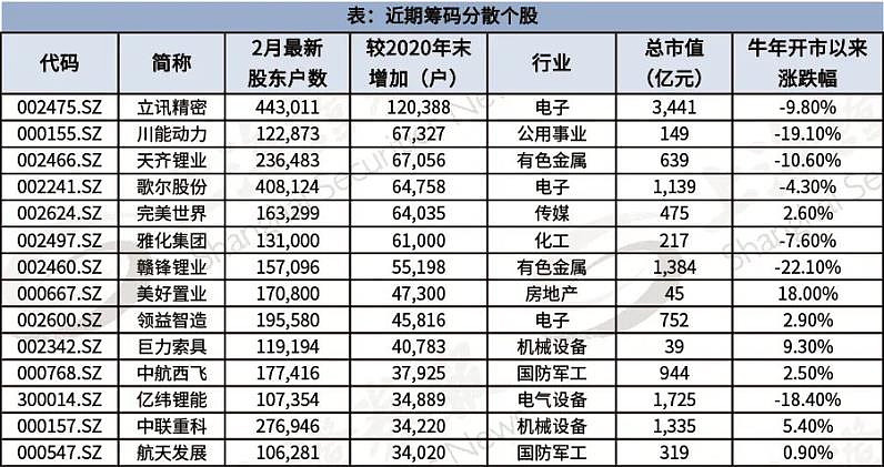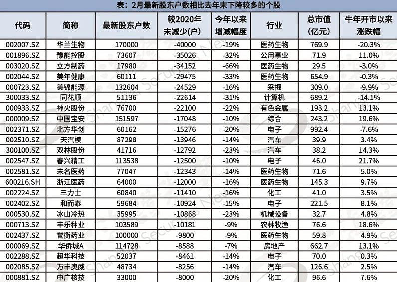牛年开市以来有580余家A股上市公司在互动平台披露了最新的股东户数。梳理可见,这些公司中,若剔除2020年下半年后上市的次新股,则2月中下旬最新股东户数相比2020年末降幅较大的个股主要集中在医药生物、汽车、电子、化工等板块。