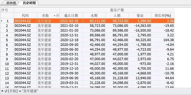 大市值的龙头企业中,美年健康近几个月股价波动不小,股东户数也起起伏伏。公司去年三季度末的股东户数仅约4万户,至年末增至8.96万户,近期又降至6万户左右,其股东数增减与股价的涨跌趋势变化正好相反。