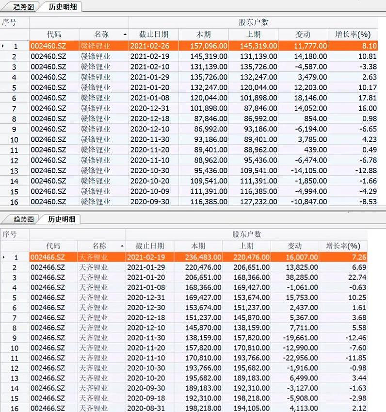 但自2020年12月以来,赣锋锂业及天齐锂业的股东户数逐期上升。目前赣锋锂业、天齐锂业最新股东户数分别为15.7万户、23.6万户,分别较去年底增加5.5万户(35%)、6.7万户(28%)。