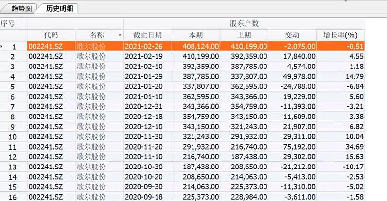 歌尔股份最新股东户数40.8万户,较去年底增加约6.5万户,增幅16%;相比去年10月30日时18.7万户的股东户数,短短4个月间已经翻倍。