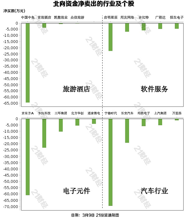 北向资金减持了25个行业,其中旅游酒店最多,净卖出金额达6.73亿元,其次是软件服务行业,净卖出6.60亿元。