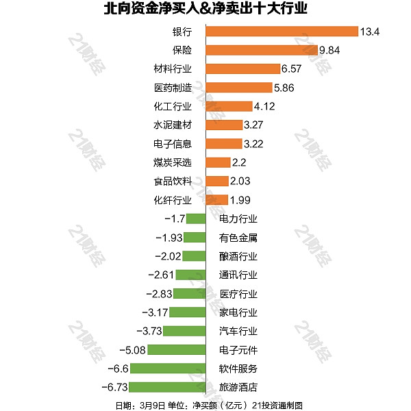 从净买入金额来看,北向资金增持了35个行业,其中银行居首,净买入金额达13.40亿元,其次是保险行业,净买入9.84亿元。