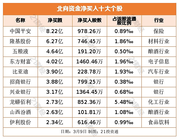 个股方面,北向资金净买入中国平安(601318.SH)、隆基股份(601012.SH)、五粮液(000858.SZ)、东方财富(300059.SZ)、比亚迪(002594.SZ)居前,其中,中国平安被净买入8.22亿元,隆基股份被净买入6.27亿元,五粮液被净买入4.64亿元,东方财富被净买入4.02亿元,比亚迪被净买入3.90亿元。