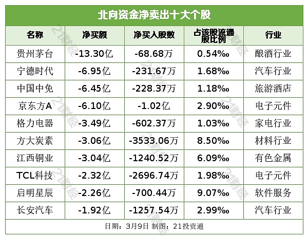 北向资金净卖出贵州茅台(600519.SH)、宁德时代(300750.SZ)、中国中免(601888.SH)、京东方A(000725.SZ)、格力电器(000651.SZ)居前,其中,贵州茅台被净卖出13.30亿元,截至目前,已连续9日被净卖出,累计超65亿元。自2月17日创出新高2627.88元后,贵州茅台近14个交易日股价已跌去25.53%,目前收于1936.99元/股。