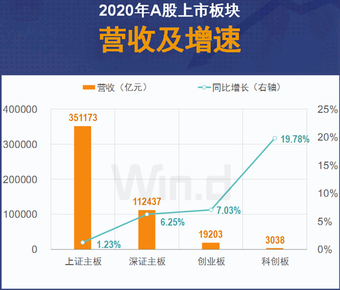 2020年各板块的业绩增长出现分化。科创板公司表现尤为亮眼。营收增速达19.78%,位居各板块首位。