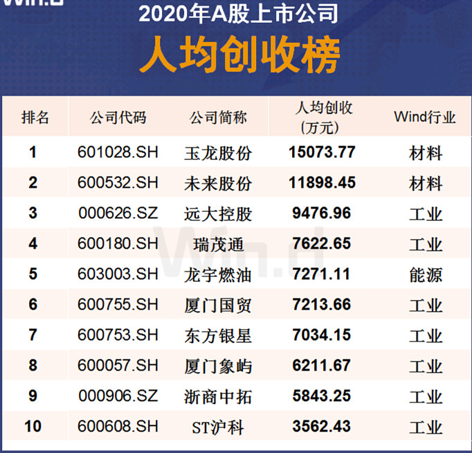 10 A股公司人均创收TOP10