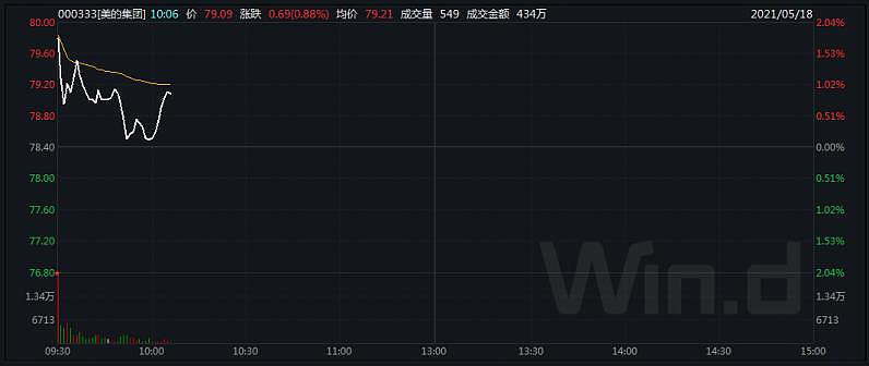 截至5月17日收盘,美的报收78.4元/股,总市值为5525亿元。5月18日,受造车消息刺激,美的集团早盘以79.80元高开,后受大盘影响,略有回调。