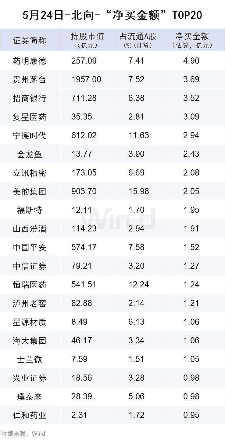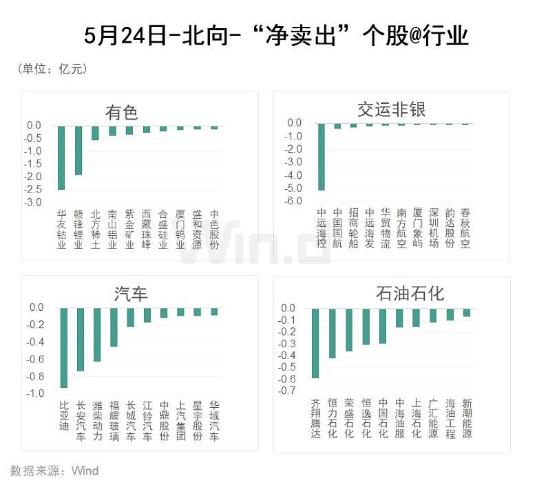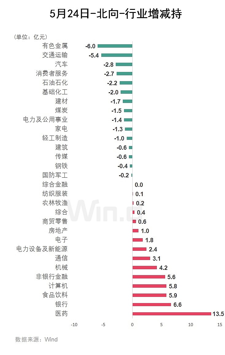 Wind通过统计分析发现,从行业角度来观察,5月24日,北向资金净买入前五的行业有:医药、银行、食品饮料、计算机、非银行金融;净卖出金额靠前的行业有:有色金属、交通运输、汽车、消费者服务。