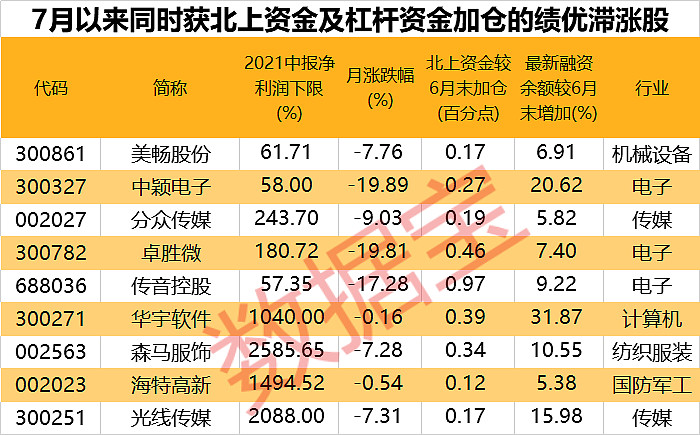 进一步来看,上述93股中,上半年业绩同比增长50%以上(下限),且7月以来股价下跌个股仅有9只,包括中颖电子、分众传媒等,陆股通加仓幅度居前的有传音控股、卓胜微。华宇软件及中颖电子融资余额均增加20%以上,华宇软件是国内法律科技智慧信息服务的主要领导服务商,今年上半年净利润同比增长超10倍,7月以来股价小幅下跌0.16%;上半年净利润增长20倍以上的光线传媒、森马服饰7月以来股价跌幅均超过7%,2股7月以来均获得融资余额10%以上的加仓。
