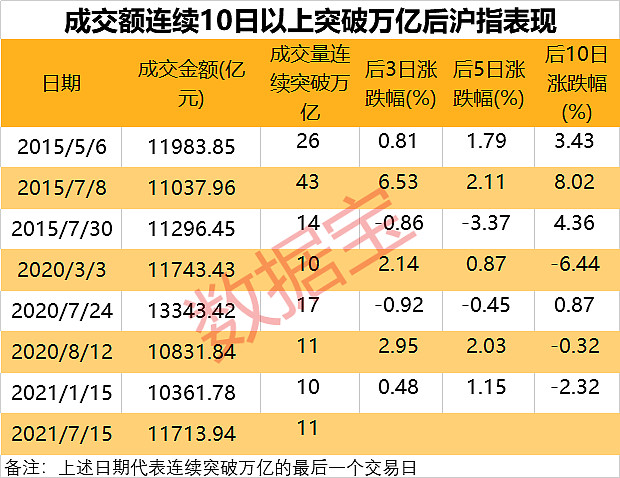 连续突破万亿后,市场怎么走?证券时报·数据宝取以上8个时间点进行分析发现,连续突破万亿的后3日,后5日及后10日累计表现涨多跌少。以最近一次为例,截至2021年1月15日,沪深两市连续10日突破万亿,在此后3日,沪指累计涨0.48%,后5日沪指累计涨1.15%。