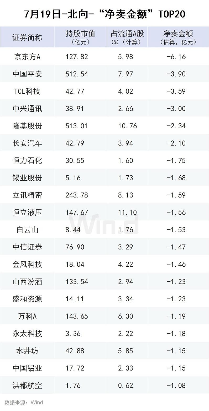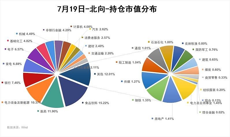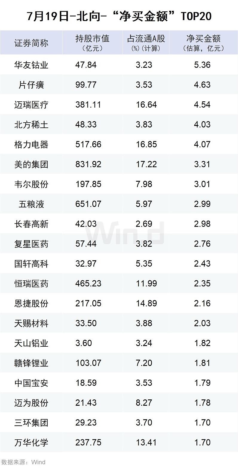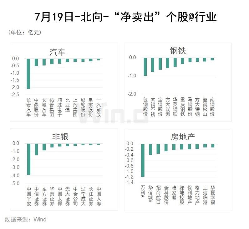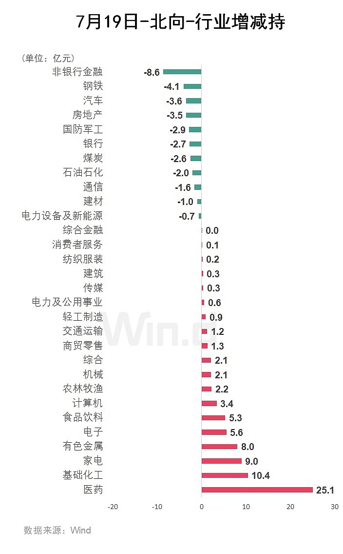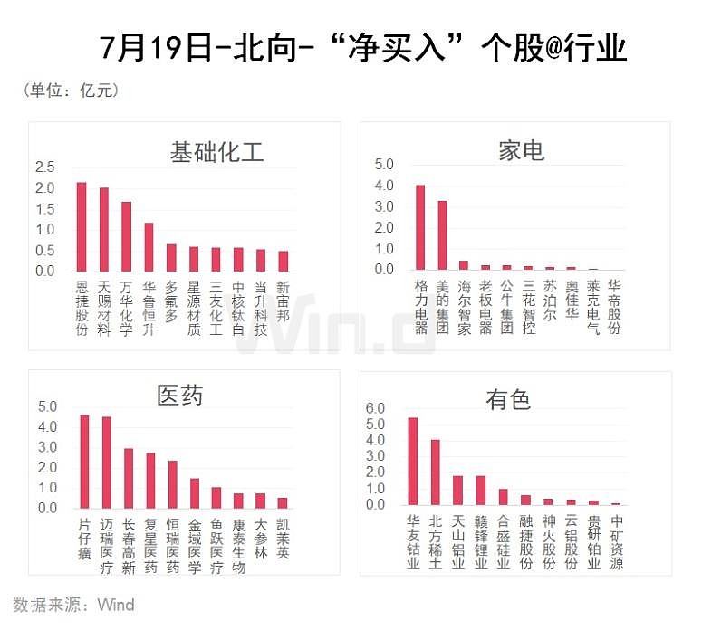 Wind通过统计分析发现,从行业角度来观察,7月19日,北向资金净买入前五的行业有:医药、基础化工、家电、有色金属、电子;净卖出金额靠前的行业有:非银、钢铁、汽车、房地产、国防军工。