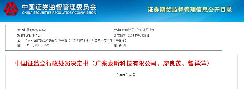 证监会也对龙昕科技信息披露违法违规行为进行了立案调查、审理。决定对龙昕科技责令改正、给予警告,并处以60万元罚款;对时任龙昕科技总经理、法定代表人廖良茂给予警告,并处以30万元罚款;对时任龙昕科技财务负责人曾祥洋给予警告,并处以20万元罚款。