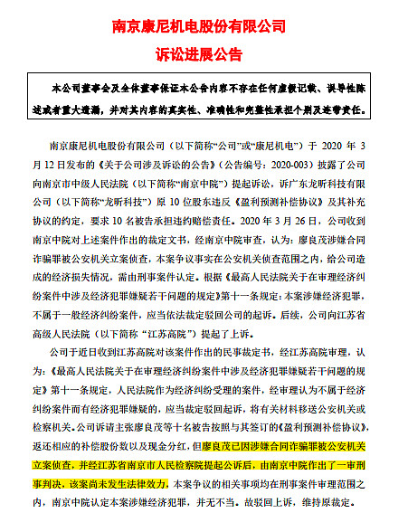 去年11月27日,康尼机电公告,龙昕科技原法定代表人廖良茂于2018年8月28日因涉嫌合同诈骗罪被南京市公安局经济技术开发区分局进行立案侦查,经南京中院审理认为:被告人廖良茂在签订、履行合同过程中,骗取公司财物,数额特别巨大,其行为已构成合同诈骗罪。公诉机关指控被告人廖良茂犯合同诈骗罪的事实清楚、证据确实充分,指控罪名成立。